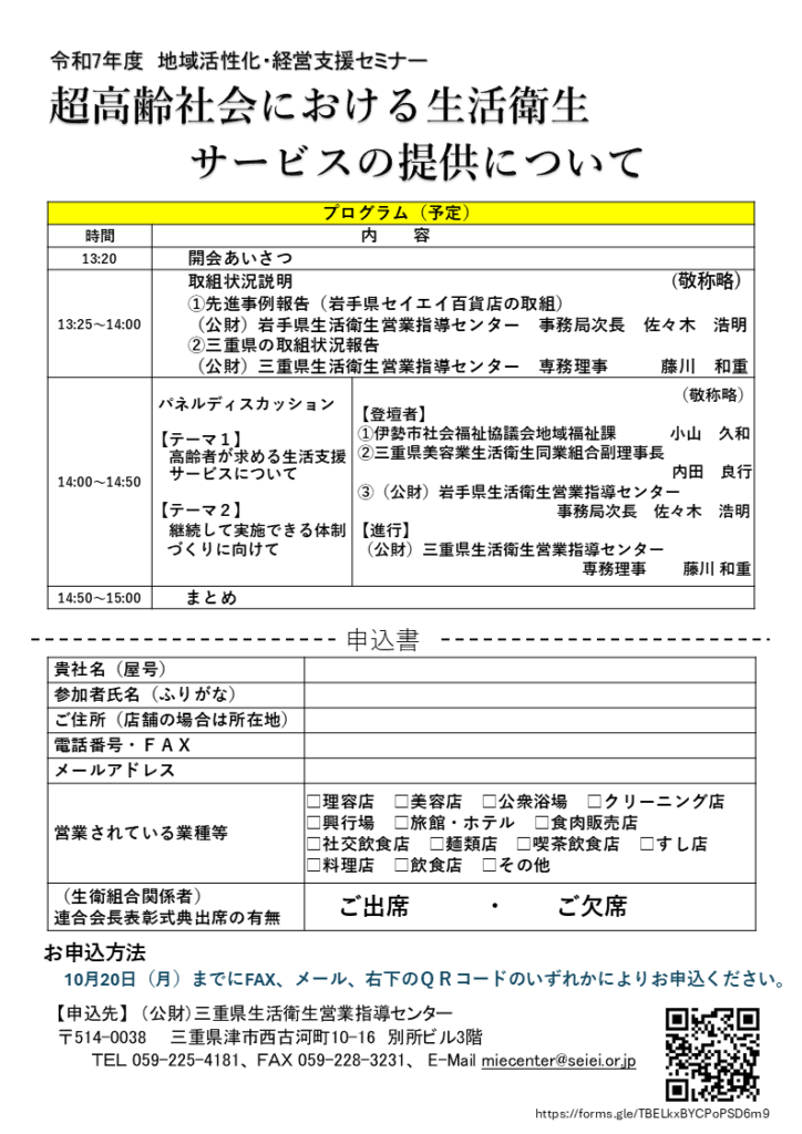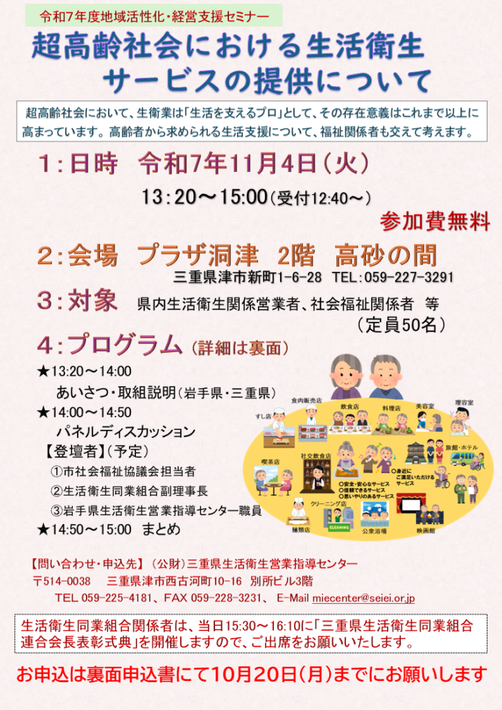 地域活性化・経営支援セミナー「超高齢社会における生活衛生サービスの提供について」を開催します! 2025 9/10 September 10, 2025 超高齢社会において、生衛業は「生活を支えるプロ」として、その存在意義はこれまで以上に高まっています。高齢者から求められる生活支援について、福祉関係者も交えて考えます。申込及び詳細は下記チラシをご覧ください。 投稿